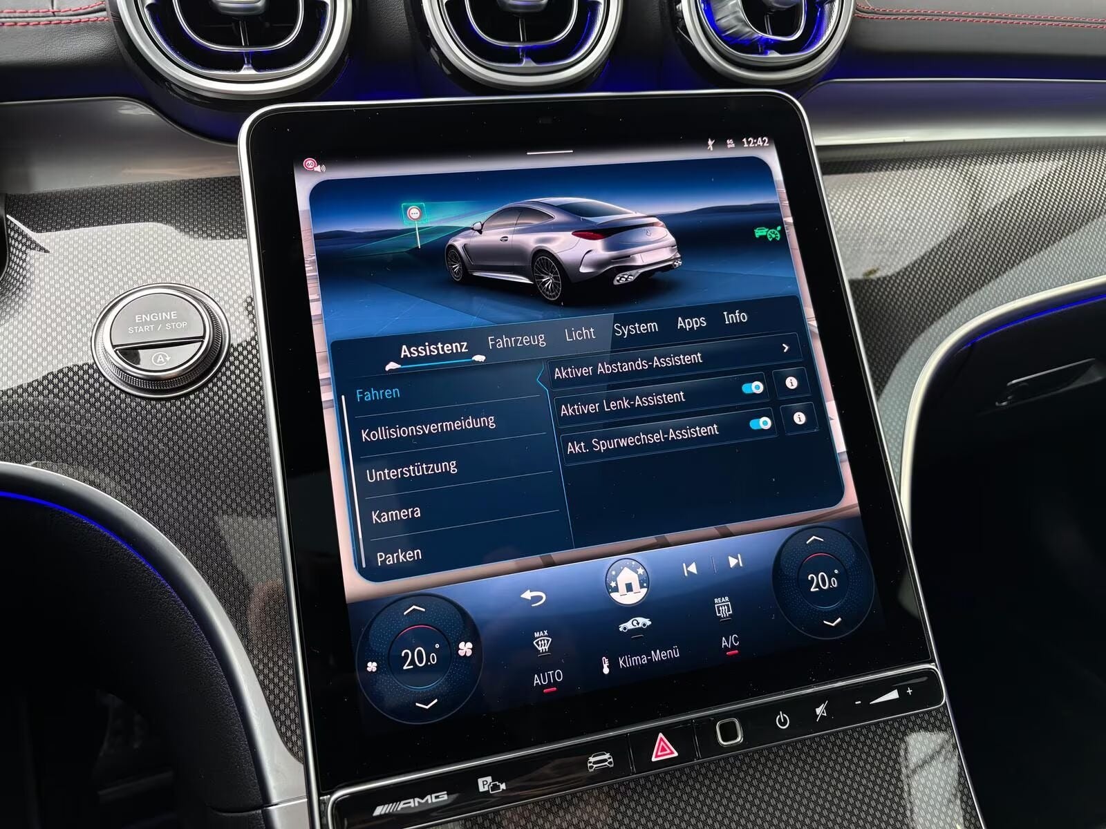 Opalithvid metallak, sort læder/alcantara, AMG multifunktionsrat i Nappa-læder, elektriske justerbare forsæder med memory, læderbeklædt instrumentbord og dørsider, sort træfinér med aluminiumsindlæg, Premium Plus ambientebelysning, i-Size-Marking, interiørlyspakke, Keyless Entry- & Go, 2-zone klimaanlæg, sort himmel, vinterpakke, ratvarme, sædevarme, spejlpakke, automatisk nedblændelige ind- og udvendige spejle, elektrisk justerbare sidespejle, opvarmede og indklappelige sidespejle, memorypakke, elektrisk ratindstilling, elektrisk lændestøtte, smartphone integrationspakke (Apple CarPlay og Android Auto), Burmester® surround sound system, MBUX Navigation Premium med Live Traffic, Augmented reality navigation, MBUX multimediesystem Premium, MBUX Entertainment inkl. videostreaming, trådløs opladning, DAB-radio, Mercedes me, MBUX interiørassistent, adaptiv fartpilot, aktiv afstandsassistent DISTRONIC PLUS, PRE-SAFE®, eCall nødkald, aktiv bremseassistent, ATTENTION ASSIST, aktiv styreassistent, Blind Spot Assist, oversigt ved trafiklys, aktiv parkeringsassistent, aktiv vognbaneskiftassistent, 360° kamera (surround view), aktiv køassistent, rutebaseret hastighedstilpasning med slutkøfunktion, automatisk fjernlysassistent PLUS, skiltegenkendelse, aktiv vognbaneassistent, baghjulsstyring, projektionsfunktion via forlygter, DIGITAL LIGHT LED-forlygter, fingeraftryksscanner, personlig lydtilpasning, regnsensor, dæktryksovervågning, logoprojektion i sidespejle, tonede ruder bag, opvarmet sprinklervæskeanlæg, elektrisk bagklap, forstørret brændstoftank, rødlakerede bremsekalibre, TIREFIT, AGILITY SELECT, udvidede digitale lysanimationer, AMG Night-pakke eksteriør og AMG Night-pakke II, tyverisikring PLUS, Premium lyspakke, belyste AMG-indstigningslister, AMG Drive Unit, AMG RIDE CONTROL, brandslukker, røde sikkerhedsseler, AMG Real Performance Sound, AMG tankdæksel, m.m.
