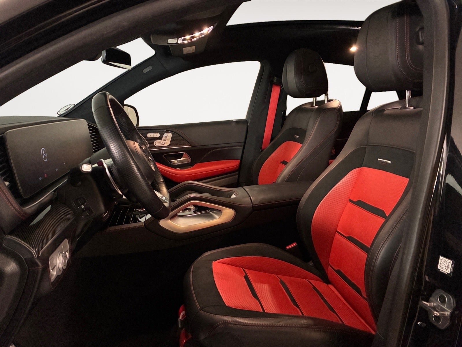 Obsidiansort-metal, sort/rød Nappa læder, 21" AMG letmetalfælge i multi-egers design, trinbræt i aluminium med gummiknopper, Keyless Go komfortpakke med sensorstyret elektrisk bagklap, AMG Night pakke inkl. sorte rudelister, mørketonede ruder bag, køl og varme i kopholder, vinterpakke inkl. varme i rat og opvarmet sprinkleranlæg, AMG Track Pace, 180° frontvisning til terrænkørsel, trådløs mobilopladning, vinduessprinkleranlæg med varme, fingeraftrksscanner, opbevaringsrum for med varme, parkeringssensor for og bag inkl. bakkamera, AMG multifunktionssportsrat med varme og AMG rattaster (AMG DRIVE UNIT), smartphone integrationspakke med Apple CarPlay og Android Auto, komforthovedstøtter for, 4-zonet klimaanlæg, logoprojektion over spejle, MBUX navigation Premium med Live Traffic og Augmented Reality, udvidet automatisk igangsætning ved køkørsel, strækningsbaseret hastighedstilpasning, 4-vejs lændestøtte i forsæder, indstigningslister med belyst AMG tekst, luftkvalitetspakke, komfortvarmepakke, akustisk komfortpakke, blindvinkelsassistent, ambientebelysning i 64 farver, instrumentpanel og sidebeklædning på døre i ARTICO kunstlæder, interiørlister i poleret kulfiber design, vejskiltegenkendelse, DAB radio, sort lofthimmel, 9-trins automatgearkasse, aut. nedblændeligt bakspejl og ved sidespejl, sideairbags bagerst, knæairbag, Ecall-nødopkaldssystem, dæktrykkontrolsystem, ildslukker, ISOFIX, m.m.